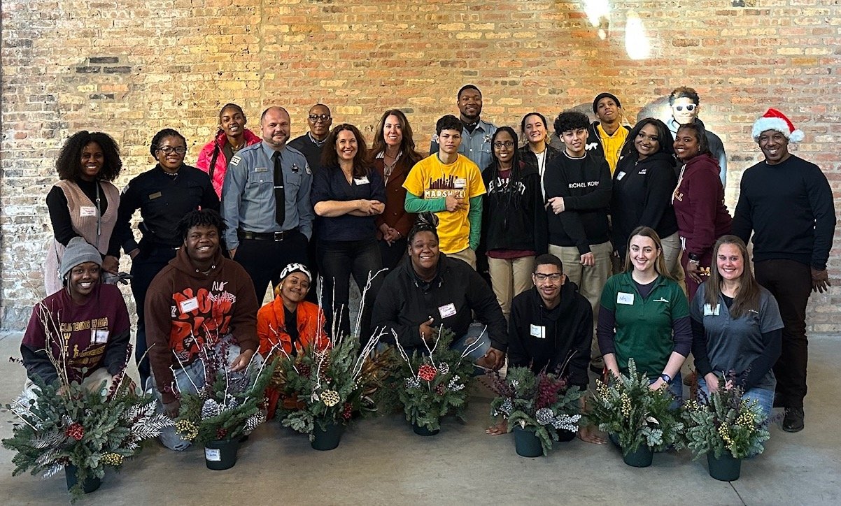 One For One Interns create holiday planters with local law enforcement members from the West Side community, along with volunteers from Mariani Landscape.